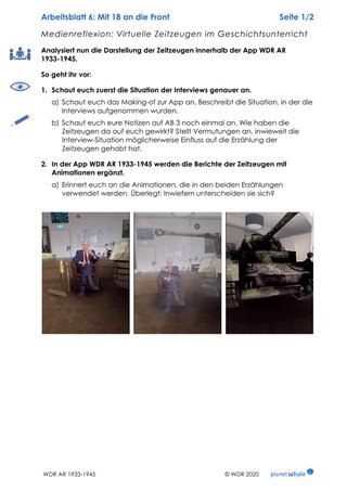Dann beschreiben die Schülerinnen und Schüler die Animationen, mit denen die Zeitzeugenberichte ergänzt sind, und analysieren diese. Sie prüfen, ob die Animationen die Aussage der Zeitzeugen hinsichtlich ihrer persönlichen Schuld unterstützen oder nicht und überlegen, in welchen Medien – beispielsweise Computerspiele – ähnliche Animationen verwendet werden.