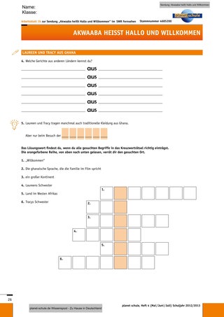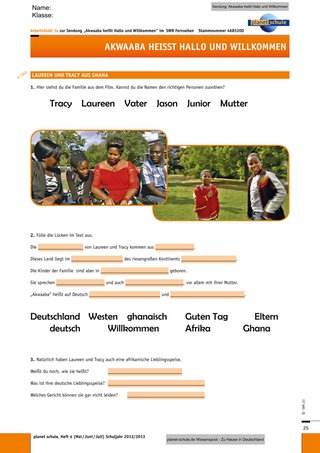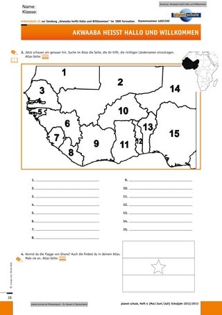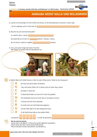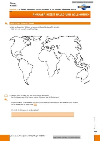 An der Tafel oder in einem Kartenständer hängt eine große Weltkarte. An der Stelle, an der Ghana liegt, hat die Lehrkraft ein kleines Foto von Laureen und Tracy befestigt. Die Kinder können nun Mutmaßungen darüber äußern, warum dieses Foto gerade dort hängt. Vielleicht fallen auch schon Begriffe wie „Afrika“ o.ä., diese können Sie in einer losen Ideensammlung an der Tafel festhalten.