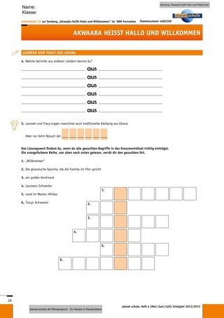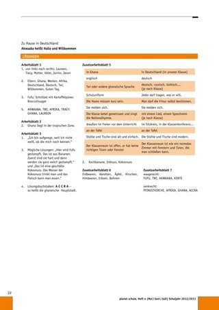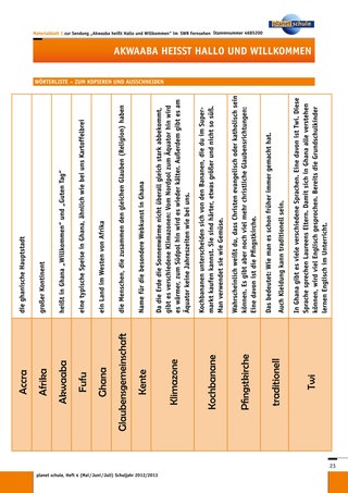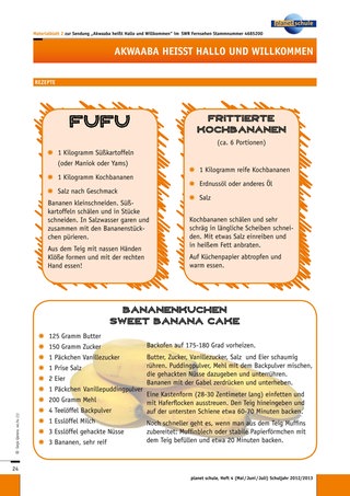 Ein schöner Abschluss für die Einheit wäre ein gemeinsames ghanaisches Essen. Vielleicht finden Sie Fufu-Pulver zum Anrühren, sodass die Kinder einmal Laureens und Tracys Leibspeise probieren können. Das Fufu kann auch frisch zubereitet werden (siehe Rezept), dann können alle Kinder beim Kleinschneiden helfen. Kochbananen können in Scheiben in der Pfanne angebraten werden. Vielleicht haben Sie die Möglichkeit, eine Schulküche zu nutzen und können Schüler höherer Klassen oder Eltern zur Unterstützung gewinnen.
