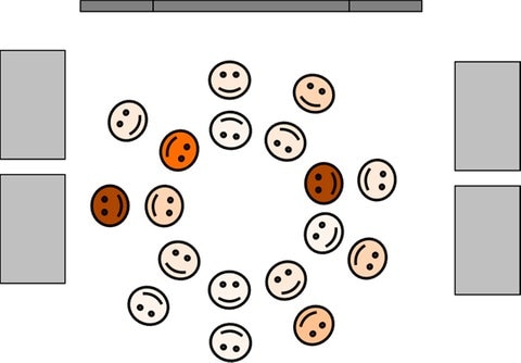 Die Klasse wird in zwei gleich große Gruppen geteilt. Die erste Gruppe bildet einen Stuhlkreis, allerdings mit dem Gesicht nach außen. Dann setzen sich die Kinder der zweiten Gruppe so, dass sie immer einem der ersten Gruppe gegenüber sitzen (ist die Anzahl ungerade, nimmt die Lehrkraft einfach teil!).
