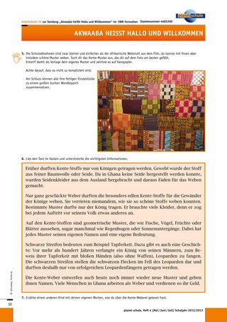 Bei der Arbeit an der Weltkarte und am Schul-Kochbuch müssen und können nicht alle Kinder gleichzeitig und an den gleichen Aufgaben beteiligt sein. Bereiten Sie deswegen zu einem günstigen Zeitpunkt die Arbeit mit den Webrahmen vor. Die meisten Kinder kennen die Grundzüge der Webtechnik. Was aber wahrscheinlich noch erklärt werden muss, ist das Weben mit zwei verschiedenfarbigen Schussfäden gleichzeitig. Weisen Sie die Kinder darauf hin, dass sie ihre Vorlagen nicht zu kompliziert gestalten sollen. Da die Arbeitsblätter zum Weben wahrscheinlich nur schwarz-weiß bereitgestellt werden können, sollten Sie zwei oder drei farbig ausgedruckte und eventuell vergrößerte Exemplare bereitlegen.