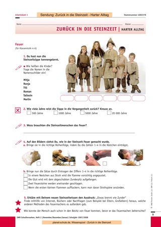 Die Sendungen „Zurück in die Steinzeit“ eignen sich gut als Einstieg in die Unterrichtseinheit, da sie sehr viele verschiedene Bereiche des Themas „Steinzeit“ aufgreifen. So gewinnen die Schüler schnell einen Überblick. Ihre Aufmerksamkeit wird auch durch die Identifikationsmöglichkeiten mit den Kindern in den Sendungen geweckt – die Frage „Wie wäre es mir wohl bei diesem Experiment ergangen?“, geht sicher jedem durch den Kopf und ergibt immer wieder interessante Diskussionsansätze.