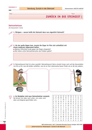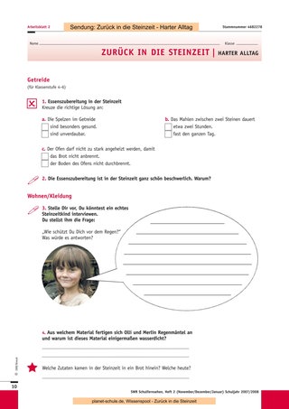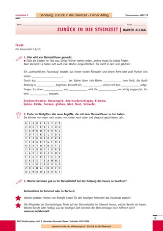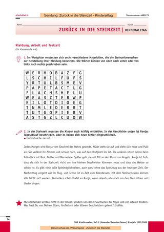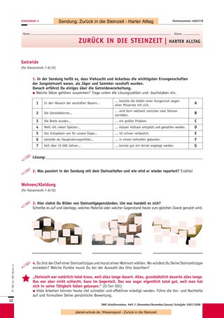 Nach der Klärung einiger Begriffe aus der Wörterliste wird dann die Sendung „Zurück in die Steinzeit – Harter Alltag“ gezeigt. Wahrscheinlich werden nun zahlreiche Fragen auftauchen. Die verbleibende Zeit können Sie investieren, um diese in Ruhe zu beantworten, zur Beantwortung an die Schüler zurückzugeben oder für einen späteren Zeitpunkt festzuhalten. Dann bearbeiten die Schüler die Arbeitsblätter 1/2 (Klasse 4–6) oder 3/4 (Klasse 7–10) in ihrem individuellen Tempo. Wer fertig ist, widmet sich den Sternchen- Fragen, die über die Inhalte hinausgehen, die in der Sendung gezeigt werden.