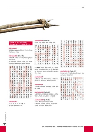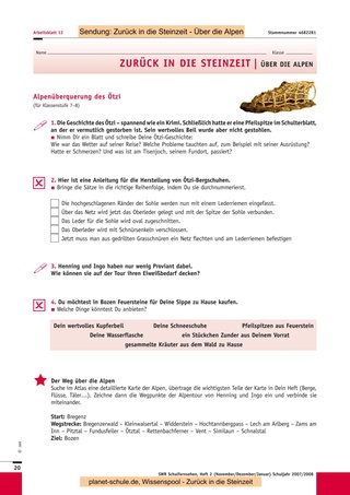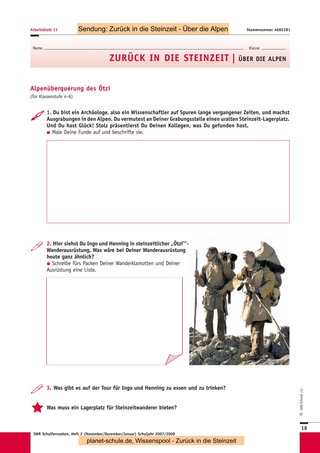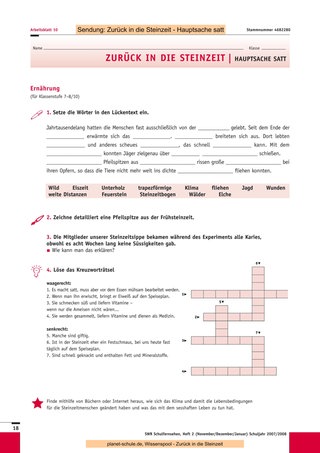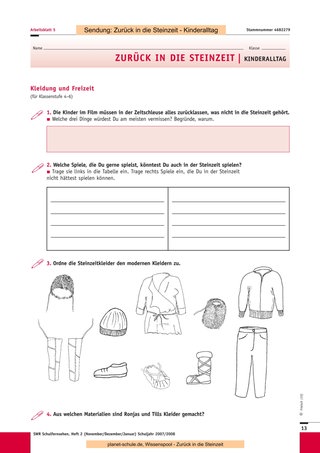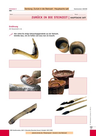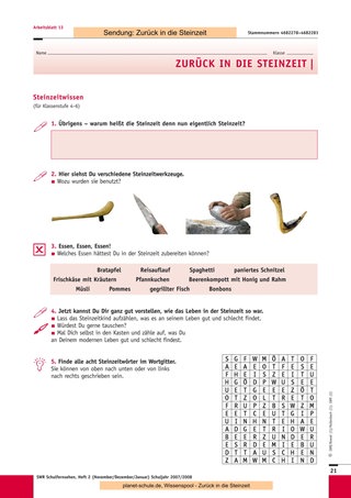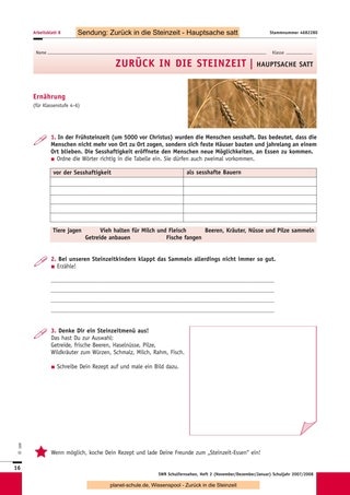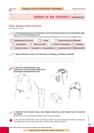Mit den drei folgenden Sendungen („Kinderalltag“, „Hauptsache satt“, „Über die Alpen“) können Sie ähnlich vorgehen. Eine Unterrichtsstunde ist jeweils ausreichend für das Anschauen des Films, die Vorund Nachbesprechung sowie die Erledigung der jeweiligen Arbeitsblätter. Sternchenfragen von vorhergehenden Arbeitsblättern, die noch offen sind, können auch später noch bearbeitet werden, da der Gesamtzusammenhang immer gegeben ist. Sie können jederzeit eine oder mehrere Experimentier- oder Gestaltungsstunden dazwischenschieben, da die Sendungen auch einzeln gut verständlich sind. Die Schüler können auch für jede Sendung ein Plakat mit Steinzeitzeichnungen anfertigen, die den Inhalt der Folge wiedergeben. In Partnerarbeit können sich die Schüler kurze Texte ausdenken, in denen ein Steinzeitmensch von einem Journalisten über seine Epoche befragt wird. Sind alle Sendungen gezeigt, wird das Blatt mit den zusammenfassenden Fragen bearbeitet. Darauf kann dann eine abschließende Besprechung folgen. Als Ausklang der Einheit wäre eine gemeinsame Aktion wie das Kochen des Steinzeitmenüs schön, ein Steinzeitfest mit Lagerfeuer und selbst ausgedachten Spielen oder natürlich eine Exkursion in ein passendes Museum.