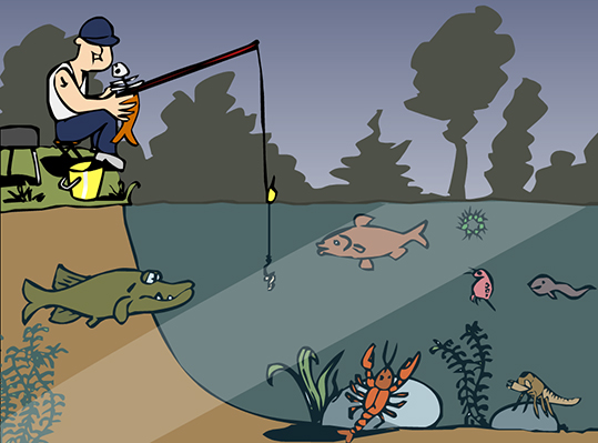 Die Bedienung der interaktiven Animation ist intuitiv: Einfach das gewünschte Tier anklicken und schon kann man einen Teil der Nahrungskette erleben. Kaulquappen zum Beispiel werden von den Insektenlarven des Gelbrandkäfers gefressen, während der Hecht sich als Raubfisch von anderen Fischen ernährt. Am Ende der Nahrungskette steht der Mensch, der mithilfe seiner Angel den Hecht fängt. Die Reste seiner Mahlzeit werden von Destruenten wie Würmern, Insekten oder Krebsen zersetzt, wodurch sich der Nahrungskreislauf schließt.