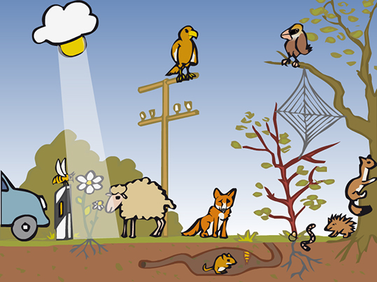 In der Animation zur Nahrungskette in Feld und Flur schnappt sich ein Rotmilan ein Hermelin. Weitere Tiere, die Teil dieses Ökosystems sind, sind ebenfalls zu sehen.
