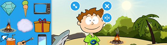 Auf dem Titelblatt wird der Titel der Geschichte, der Name der Autor:innen und die Hauptfigur gezeigt. Anschließend folgen beliebig viele Seiten der Geschichte. Eine Unterwasserlandschaft, ein Tiger oder eine Gewitterwolke – die App bietet mehr als 400 Figuren, Hintergründe und Gegenstände. Diese regen Schüler:innen an, eigene Bildergeschichten zu erfinden und stringent zu erzählen. Alle Figuren und Gegenstände lassen sich kombinieren, verkleinern, vergrößern, drehen, spiegeln und beschriften.