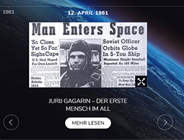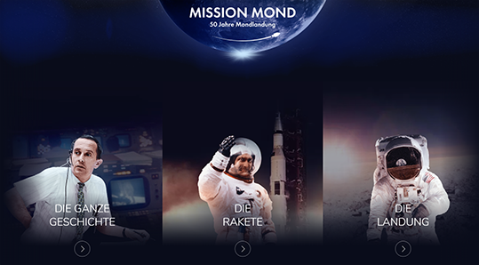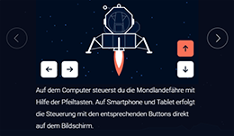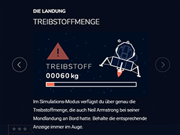 Das interaktive Element „Mission Mond“ fasst in einer Timeline nochmals alle wichtigen Ereignisse auf dem Weg zur bemannten Mondlandung zusammen. Die mächtige Mondrakete Saturn V beeindruckt mit ihren atemberaubenden Daten und man kann die Mondlandefähre sicher auf dem Mond zur Landung bringen – wenn der Treibstoff reicht!