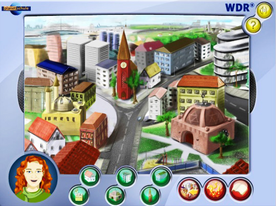 Beim Anklicken der Gotteshäuser und Wohnhäuser erscheint eine Innenansicht mit mehreren Räumen, in denen man über eine klassische Navigation Informationstexte zu den betreffenden Religionen findet. Auch hinter den Pflegeheimen und Friedhöfen verbergen sich Informationen. An diesen Orten suchen die Schüler*innen nach Antworten auf die ihnen gestellten Fragen.