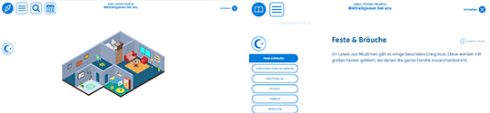 Beim Anklicken der Gotteshäuser und Wohnhäuser erscheint eine Innenansicht mit mehreren Räumen, in denen man über eine klassische Navigation Informationstexte zu den betreffenden Religionen findet. Auch hinter den Pflegeheimen und Friedhöfen verbergen sich Informationen. An diesen Orten suchen die Schüler*innen nach Antworten auf die ihnen gestellten Fragen.