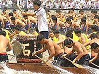 [Bild Vergrößerung] So sind in China beim berühmten Drachenboot-Festival nur Holzboote erlaubt, in Hongkong werden Fiberglasboote benutzt. Nur einige Kriterien müssen immer erfüllt sein: Das Boot muss einen Drachenkopf und einen Drachenschwanz haben, zur Mannschaft gehören außer den Paddlern immer ein Trommler und ein Steuermann.