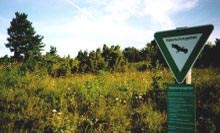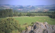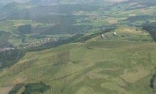 [Bild Vergrößerung] Das Hochrhönmassiv mit seinem höchsten Berg, der Wasserkuppe (950 Meter), ist das Zentrum der früheren Vulkane. Drei Bundesländer teilen sich die Rhön: Hessen, Bayern und Thüringen.