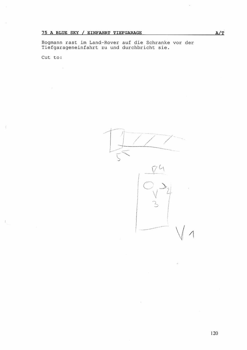 Die Skizze zeigt die verschiedenen Kamerapositionen 1 - 5, mit denen die Actionszene „Auto durchbricht Schranke“ gedreht werden soll. Diese Auflösung haben sich Kameramann und Regisseur bei der Auflösungsbesprechung überlegt.