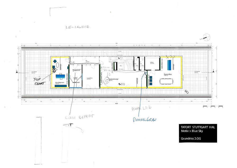 Als Grundlage für seine Planungen dienen dem Szenenbildner Grundrisse des Gebäudes, in die er die einzelnen Motive – verschiedene Büroräume, die Lobby, die Lounge sowie einen Präsentationsraum – und die dazugehörige Einrichtung einzeichnet. Es werden auch zusätzliche Wände, Türen und Fenster eingebaut oder sie „verschwinden“.