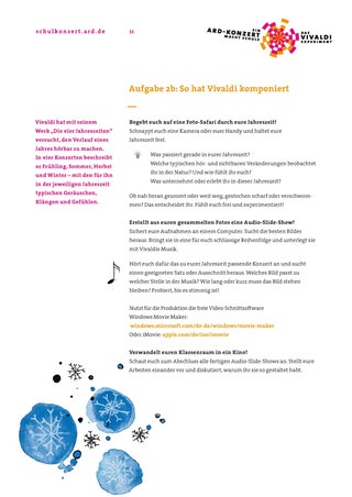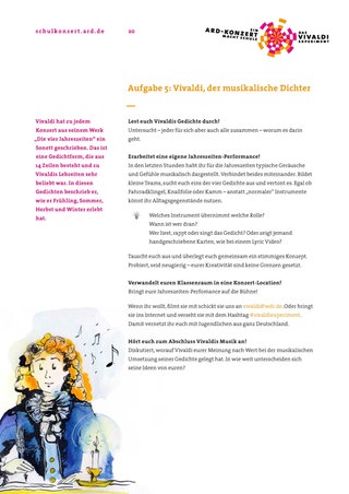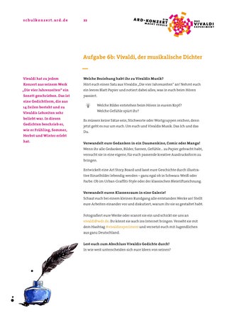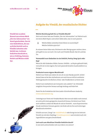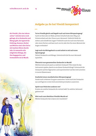 Das Material kann jedoch auch unabhängig davon flexibel im Unterricht eingesetzt werden. Neben leicht verständlichen Texten über Vivaldi, Venedig, Werkentstehung und Musikgattung sind darin verschiedene Aufgabenstellungen zu Vivaldi als Person und seinem Kompositionsprozess enthalten.