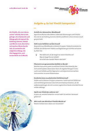 Abgeschlossen wird die Aufgabe mit dem gemeinsamen Hören eines Satzes aus dem entsprechenden Konzert der gerade vorherrschenden Jahreszeit. Anschließend kann eine Diskussion darüber gestartet werden, was Vivaldi – ausgehend von der Musik – selbst in der Natur beobachtet haben könnte!