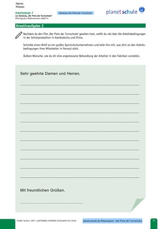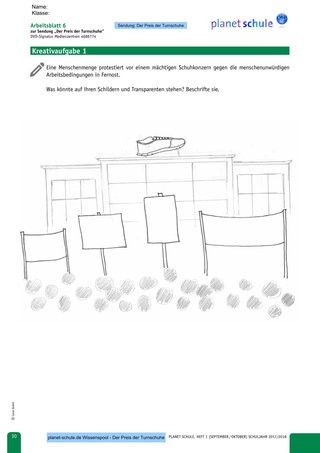 Als weitere Wahlaufgabe oder zur Weiterarbeit in einer möglichen Folgestunde dienen die Arbeitsblätter 6 und 7 als kreative Schreibaufgabe. Arbeitsblatt 6 fordert die Beschriftung von Transparenten einer Demonstrantengruppe, die vor der Firmenzentrale einer großen Sportschuhmarke gegen die ungerechten Arbeitsbedingungen demonstriert. Ein Beschwerdebrief soll hingegen mithilfe des Arbeitsblattes 7 geschrieben werden. Der Fokus liegt dabei auf den ungerechten Arbeitsbedingungen und der Äußerung von Wünschen, die man für die Arbeiter in Fernost aussprechen könnte.