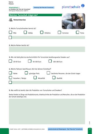 Im nächsten Unterrichtsschritt führen die Jugendlichen nun ein Partnerinterview (Arbeitsblatt 1) zu ihrem Konsumverhalten in Bezug auf Turnschuhe durch. Hierbei wird beispielsweise abgefragt, welche Sportschuhmarken sie kennen, wie viel Geld sie für Turnschuhe ausgeben und was sie bereits über Produktion oder Produktionsorte wissen.