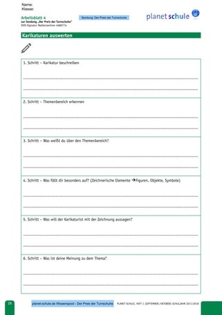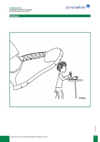 Eine andere Möglichkeit zur Auseinandersetzung mit der Thematik gelingt über die Interpretation einer Karikatur (Alternative 2 – Arbeitsblatt 3b). Diese zeigt überspitzt die Missstände in der Turnschuhproduktion auf. Die Schüler sollen hierbei in Partnerarbeit schrittweise die Interpretation der Karikatur vornehmen (Arbeitsblatt 4). Die Schüler sollen in der Lage sein, sich eine eigene Meinung zu bilden und diese vor ihren Mitschülern zu begründen und zu vertreten.