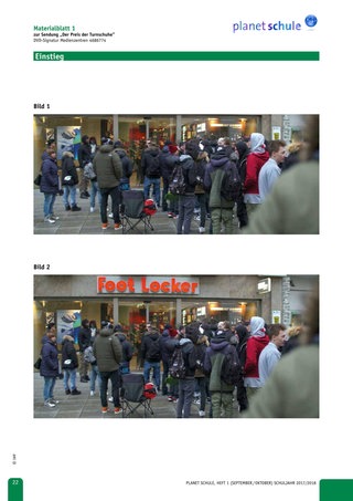 Hierbei wird ein direkter Bezug zur Lebenswelt der Schüler hergestellt. Nach einigen Spekulationen soll die Lehrkraft nun den zweiten Bildausschnitt (Materialblatt 1, Bild 2) zeigen. Den Schülern wird nun verraten, vor welchem Geschäft die Jugendlichen anstehen. Es wird ersichtlich, dass es sich um ein Geschäft handelt, das Turnschuhe verkauft. Im weiteren Unterrichtsgespräch können nun die Vorerfahrungen der Schüler ausgetauscht werden.