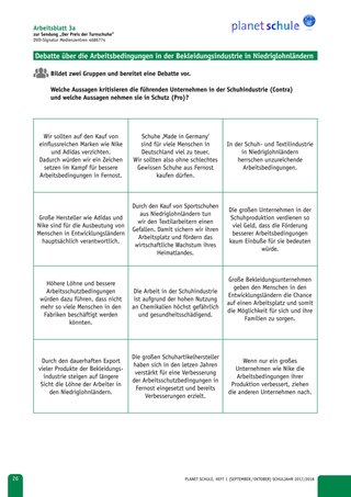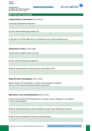 Die Schüler erhalten dazu das Arbeitsblatt 2 und sollen während des Films Fragen in Einzelarbeit beantworten. Die Fragen konzentrieren sich hierbei auf Arbeitsbedingungen in der Schuhproduktion in Fernost, den Arbeitsschutz, Risiken und Gefahren beim Kampf um bessere Arbeitsbedingungen und Alternativen in der Turnschuhproduktion. Nachdem der Film abgespielt wurde, sollen die Schüler in einer kurzen Murmelphase mit ihrem Partner die Antworten besprechen, bevor sie im Plenum gesichert werden.