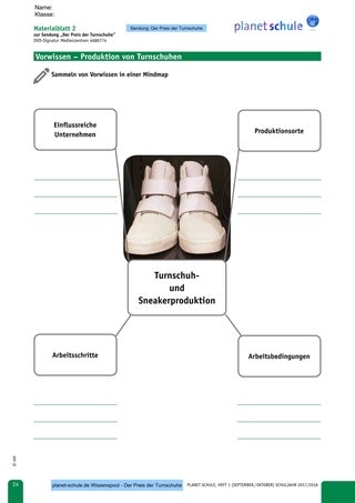 Die folgende Unterrichtsstunde soll Schülern einen Blick hinter die Kulissen der Produktion der Massenware Turnschuhe bieten. Aufgrund der Filmlänge empfiehlt sich eine Doppelstunde; der Unterricht kann auch auf zwei einzelne Stunden verteilt werden.
