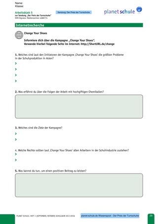 Am Ende der Stunde wird die zusammenfassende Hausaufgabe erteilt. Diese wäre alternativ auch in einer Folgestunde möglich. Bei dieser Aufgabe sollen die Schüler mithilfe des Arbeitsblattes 5 Informationen über die Kampagne „Change Your Shoes“ im Internet sammeln.