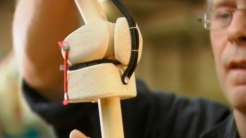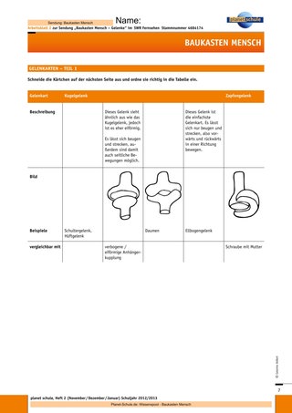 An dieser Stelle kommt der Film „Baukasten Mensch – Gelenke“ zum Einsatz, in welchem Modelle der drei Gelenke nachgebaut werden. Der Film ist in drei Kapitel (Knie, Hüfte, Schulter) unterteilt und sollte auch nach jedem Abschnitt angehalten werden, um die einzelnen Inhalte genauer zu thematisieren.