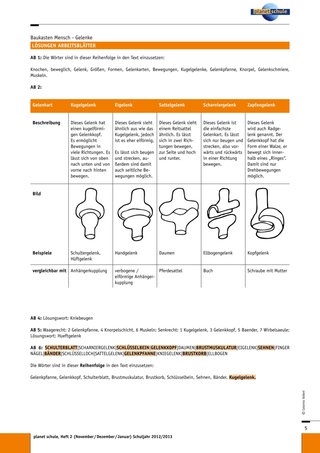 Mit AB 2 und AB 3 zu den „Gelenkarten“ werden die Grundlagen erweitert und vertieft. Auch diese Aufgaben können in Einzel- oder Partnerarbeit bearbeitet werden. Falls vorhanden, können die Gelenkarten an einem Skelettmodell gezeigt und genauer betrachtet werden. Ansonsten sollen die Schüler/innen an ihrem eigenen Körper die Beweglichkeit der einzelnen Gelenke vorsichtig austesten.