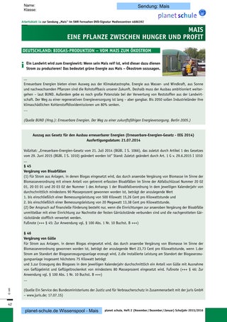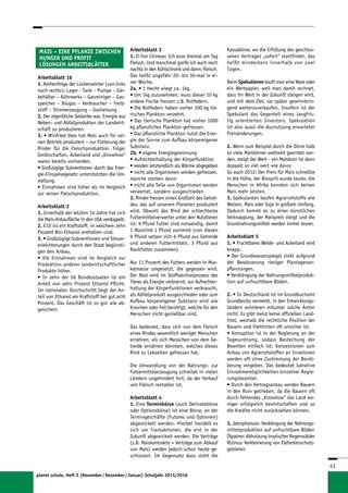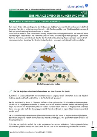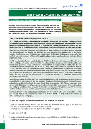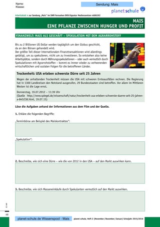 Die Arbeitsblätter mit den jeweiligen Arbeitsaufträgen werden ausgeteilt. Die Schüler einer Gruppe sind jeweils für ein Thema als Experten zuständig. Gemeinsam wird nun im Plenum die zweite Filmsequenz (Energiemais, Finanzwelt, Fleischkonsum) angeschaut. Die Experten-Gruppen konzentrieren sich jedoch auf unterschiedliche Fragestellungen – abhängig von den Fragen des Arbeitsblattes. Dies verlangt erhöhte Aufmerksamkeit beim Schauen des Films, da sowohl die erforderten Informationen als auch Zusatzinformationen mitgeteilt werden.