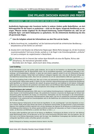 Die dritte Filmsequenz (TC 22:01-26:53) thematisiert das „Landgrabbing“ und welche Auswirkungen dies auf das Leben der heimischen Bevölkerung hat. Arbeitsblatt 5 wird hierfür bis einschließlich Aufgabe 2 bearbeitet.