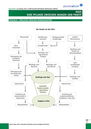 Mit der ersten Filmsequenz „Mais als Grundnahrungsmittel“ (TC 01:18-04:52), findet der Einstieg in den Unterricht statt. Diese führt die Not vor Augen, in welcher Jemimah und ihre Familie leben. Obwohl die ganze Familie arbeitet, kann sie kaum den täglichen Bedarf an Mais decken – an Fleisch oder Gemüse ist gar nicht erst zu denken. Für das Geld, welches Jemimah aus dem Holzkohleverkauf erwirtschaftet, kann sie sich jedoch immer weniger Mais hinzukaufen, da der Maispreis in Kenia ständig steigt.