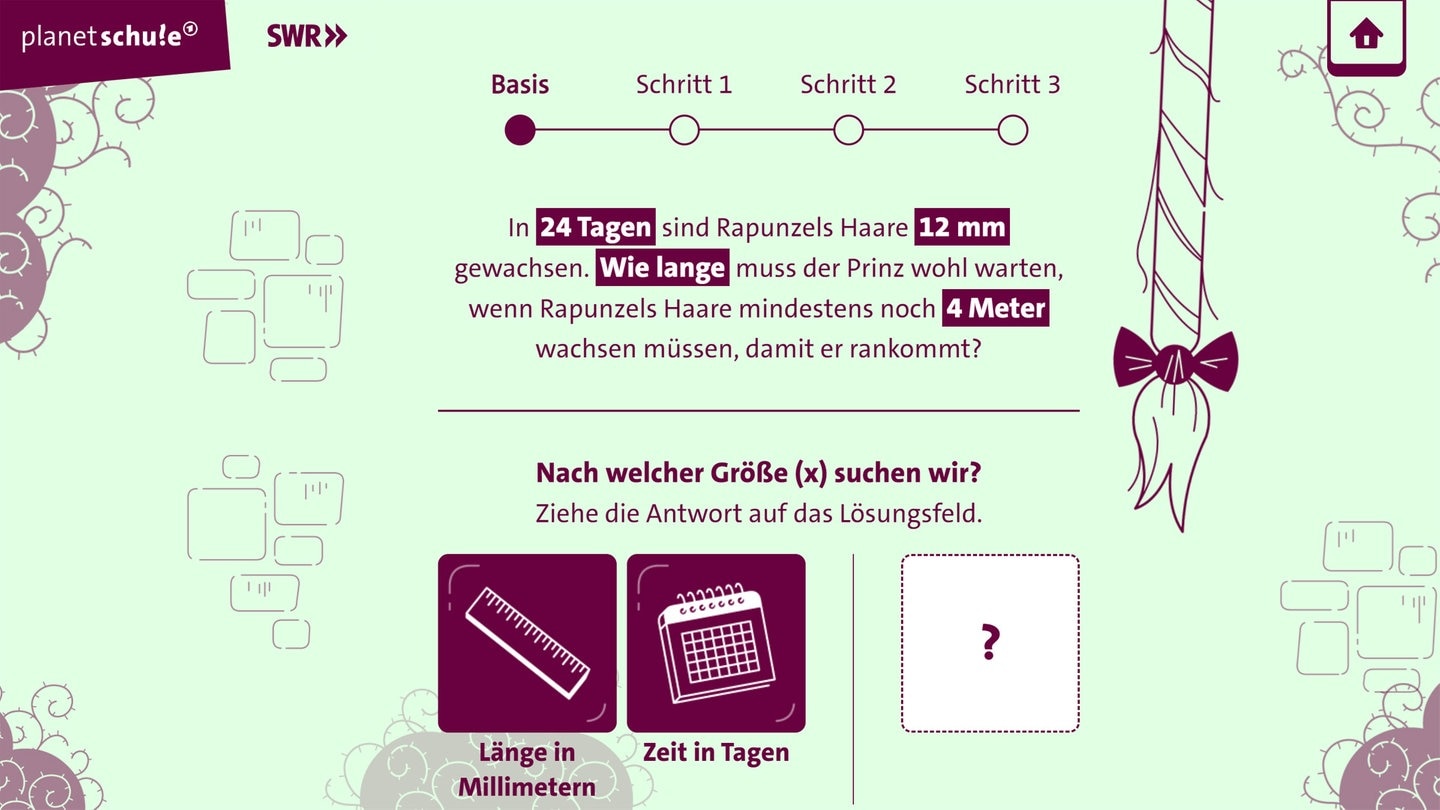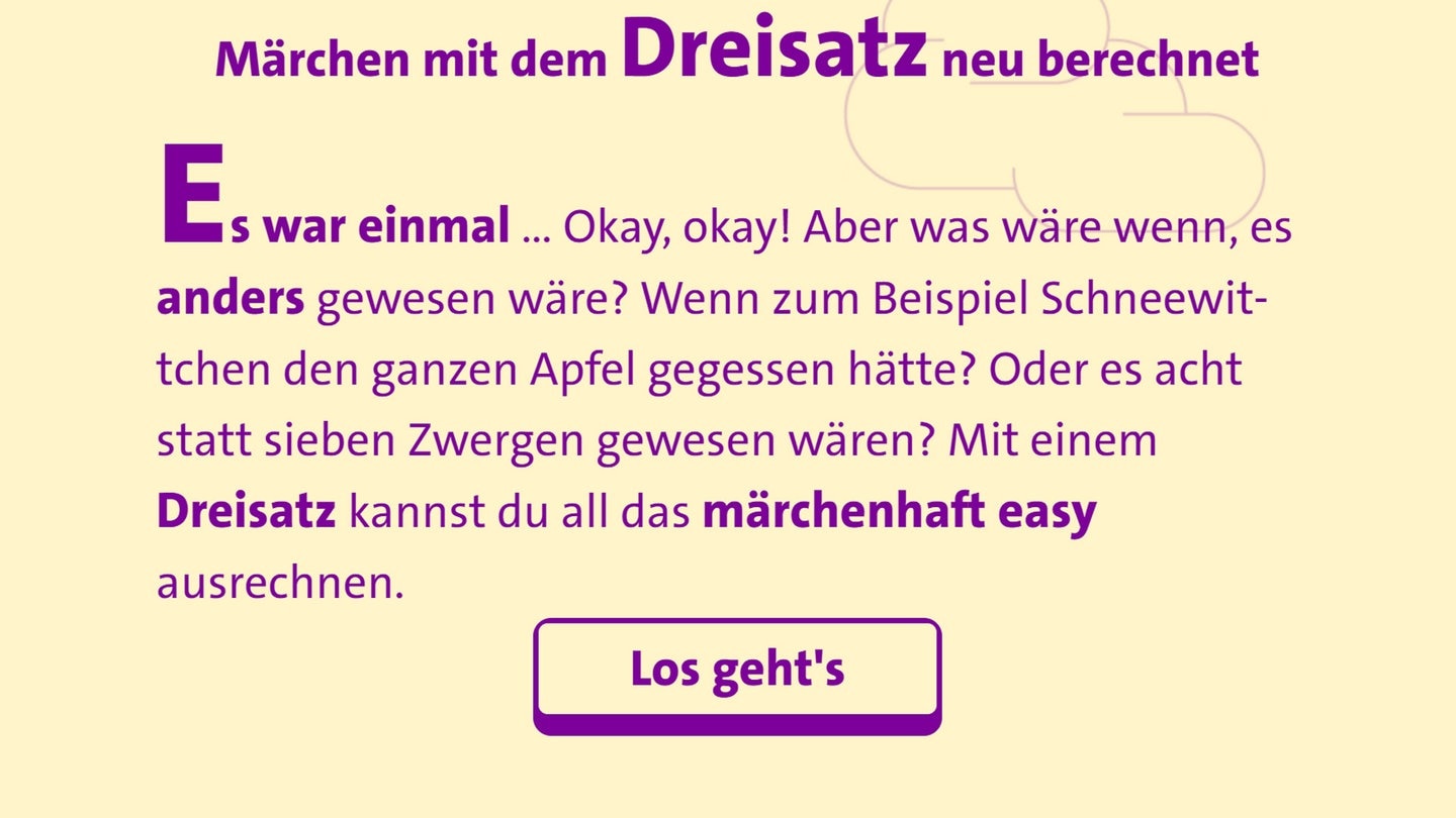Was wäre, wenn… Rapunzel sich die Haare abgeschnitten hätte? Wann hätte sie wieder einen Zopf gehabt, der bis zum Boden des Turmes reicht? Mit einem Dreisatz liegt die Lösung auf der Hand – magisch! Probiere es aus und starte hier unseren Dreisatz-Trainer:
