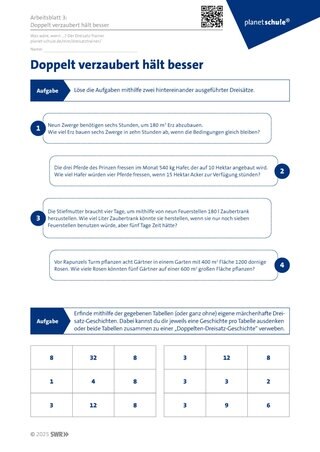 Die Schüler:innen bearbeiten die erste Aufgabe des Arbeitsblatts 3 (Doppelt verzaubert hält besser). Als Hilfestellung kann Materialblatt 1 zur Verfügung gestellt werden. Nach Kontrolle oder Besprechung der Ergebnisse mithilfe ausliegender Lösungen bearbeiten sie die Aufgaben 2-4. Schnelle Schüler:innen fahren mit den Aufgaben 5 und 6 fort.