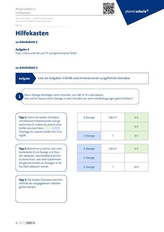 Material: Lernspiel Dreisatz-Trainer (www.planet-schule.de/mm/dreisatztrainer), Laptops oder Tablets, Arbeitsblätter 1–3, Materialblatt 1