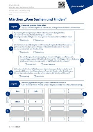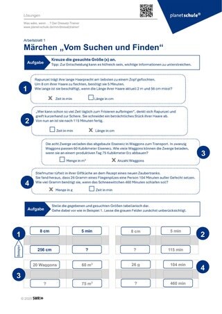Schüler:innen bearbeiten Arbeitsblatt 1 (Märchen „Vom Suchen und Finden“). Es dient der Wiederholung und Vertiefung des im Dreisatz-Trainer Geübten und gibt einen ersten Hinweis auf Verständnisschwierigkeiten.