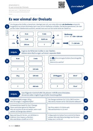 Schüler:innen bearbeiten den ersten Teil des Arbeitsblatts 2 (Es war einmal der Dreisatz), Aufgaben 1-4. Nach Kontrolle der Ergebnisse mithilfe ausliegender Lösungen bearbeiten sie den zweiten, nicht vorstrukturierten Teil des Arbeitsblattes.