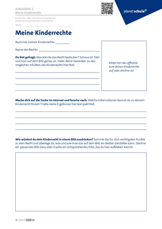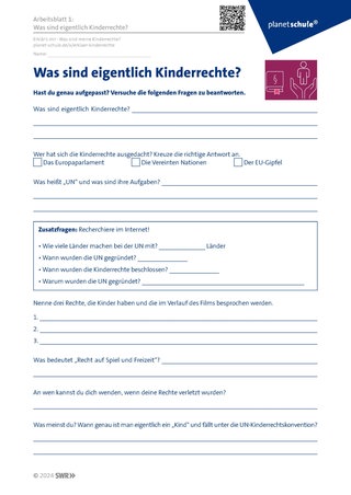 Was genau hinter den Kinderrechten steckt, erklärt der vierminütige Film, der nach dem Einstieg angesehen wird. Offene Fragen werden im Anschluss geklärt. Die Lehrkraft teilt Arbeitsblatt 1 aus und lässt die Schüler:innen die Aufgaben bearbeiten. Ggf. kann der Film zur Unterstützung ein zweites Mal abgespielt werden. Im Anschluss wird das Arbeitsblatt besprochen bzw. dient als Basis, um sich ausführlicher über das Thema „Kinderrechte“ zu unterhalten.
