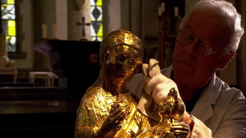 Zu diesem Schatz gehört unter anderem die goldene Madonna, die älteste Marienskulptur der Welt. Einmal im Jahr, wenn ihr Zustand überprüft wird, wird der Dom zum geschlossenen Hochsicherheitstrakt und die Madonna aus der Vitrine hinter Eisengitter und Panzerglas hervorgeholt. Üblicherweise darf niemand in diesem Moment dabei sein, und so hat das WDR-Team anlässlich der RUHR 2010 exklusive Aufnahmen machen können.