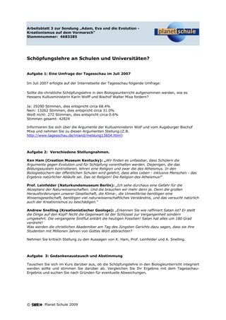 In einem weiteren Unterrichtsschritt sollen die Schülerinnen und Schüler dann die Inhalte des Biologie-Unterrichtes reflektieren. Sie bearbeiten hierfür das Arbeitsblatt „Schöpfungslehre an Schulen und Universitäten“ und diskutieren mit abschließender Abstimmung (Aufgabe 3 Arbeitsblatt).
