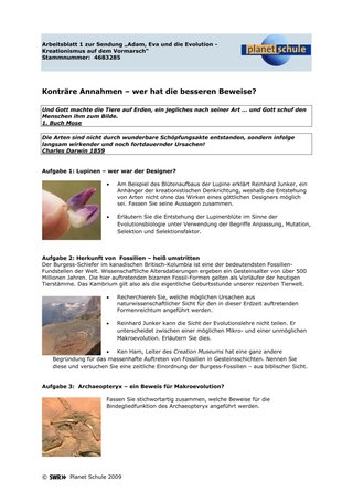 Die beiden Filme setzen sich mit dem Kreationismus auseinander. "Adam, Eva und die Evolution" beleuchtet die aktuelle Diskussion pro und contra Evolution und lässt Evolutionsgegner, Wissenschaftler und Theologen zu Wort kommen. Die inhaltliche Auseinandersetzung mit dem Kreationismus steht im Vordergrund. Wie freie christliche Privatschulen in Nordrhein-Westfalen mit der Evolutionslehre und dem Kreationismus umgehen, ist Thema des Films "Mit der Bibel zum Abitur". Hier geht es um politische und persönliche Aspekte: Sollen kreationistische Inhalte an Schulen in Deutschland gelehrt werden dürfen? Wie gehen Schüler und Lehrer in öffentlichen Schulen damit um, wenn Schüler aus religiösen Gründen Unterrichtsinhalte ablehnen? Der Film bietet Ansatzpunkte, am Beispiel des Kreationismus über die Aufgabe von Schule sowie Integration versus Parallellgesellschaften zu diskutieren. Beide Filme ergänzen sich und können fächerverbindend eingesetzt werden in Politik, Religion, Biologie und Deutsch.