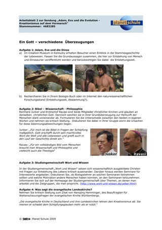 Eine interessante Herangehensweise an das Thema könnte der fächerverbindende Unterricht sein. Das Fach Biologie könnte die naturwissenschaftlichen Grundlagen der Evolutionstheorie beleuchten. Im Religionsunterricht könnten wiederum sowohl die Schöpfungsgeschichte und die Sintflut aufgearbeitet werden als auch grundsätzlich weltanschauliche Differenzen innerhalb der christlichen Kirchen erörtert werden.