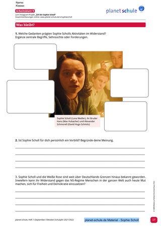 Schüler:innen Arbeitsblatt 9 ausgehändigt werden. Darauf fassen sie zentrale Gedanken, die Sophie Scholls Handeln prägten, noch einmal zusammen und schlagen einen Bogen zur Gegenwart: Sie reflektieren, inwiefern Sophie Scholl auch heute noch ein Vorbild sein kann – für sie persönlich, ebenso wie für andere Menschen weltweit, die sich für Freiheit und Demokratie einsetzen.