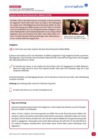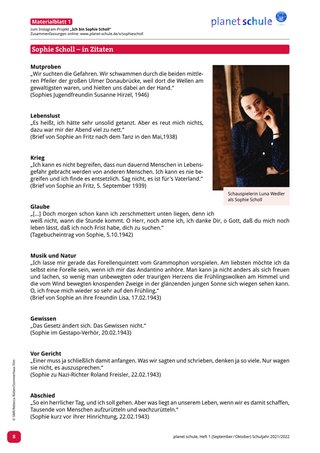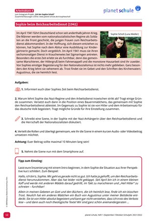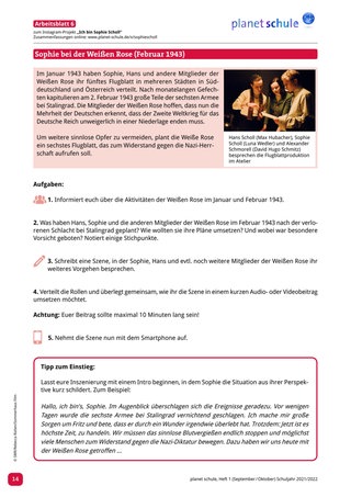 Die Unterrichtseinheit lehnt sich an diese sehr subjektiven, emotionalen und lebendigen Beiträge an. Analog zu den Videos führen die Schüler:innen ein eigenes Medienprojekt zu Sophie Scholl durch. Sie setzen sich intensiv mit zentralen Stationen in Sophie Scholls Leben auseinander, entwerfen Szenen und setzen diese in Form von kurzen Audio- oder Videobeiträgen medial um. Durch die intensive Beschäftigung mit der Biografie der jungen Frau erhalten die Schüler:innen facettenreiche Einblicke in Sophie Scholls Denken und Handeln. Die Videos vom Planet Schule-Spezial „Ich bin Sophie Scholl“ können die Schüler:innen als Recherchequelle und zur Inspiration für ihre eigenen Medienbeiträge nutzen.