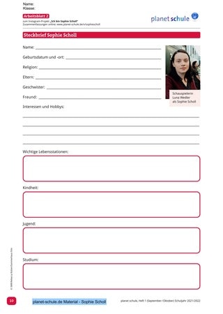 | Erarbeitung I | Die Schüler*innen informieren sich mithilfe von Arbeitsblatt 1 und dem Materialblatt über wichtige Stationen in Sophie Scholls Leben und über ihre Persönlichkeit. Anschließend füllen sie den Steckbrief auf Arbeitsblatt 2 aus. | Einzel- oder Partnerarbeit | Materialblatt: Sophie Scholl – in Zitaten Arbeitsblatt 1: Stationen in Sophie Scholls Leben Arbeitsblatt 2: Steckbrief Sophie Scholl Smartphones |