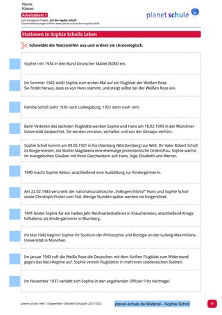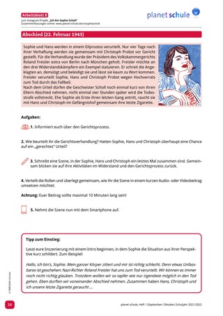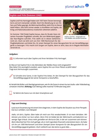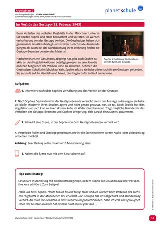 Im Anschluss setzen sich die Schüler:innen in Gruppenarbeit mit Sophie Scholl in zentralen Stationen auf ihrem Lebensweg auseinander. Mithilfe des erarbeiteten Vorwissens, zusätzlicher Arbeitsblätter und einer weiterführenden Internetrecherche schreiben die Schüler:innen Skripte für kurze Audio- oder Videobeiträge und setzen diese medial um.