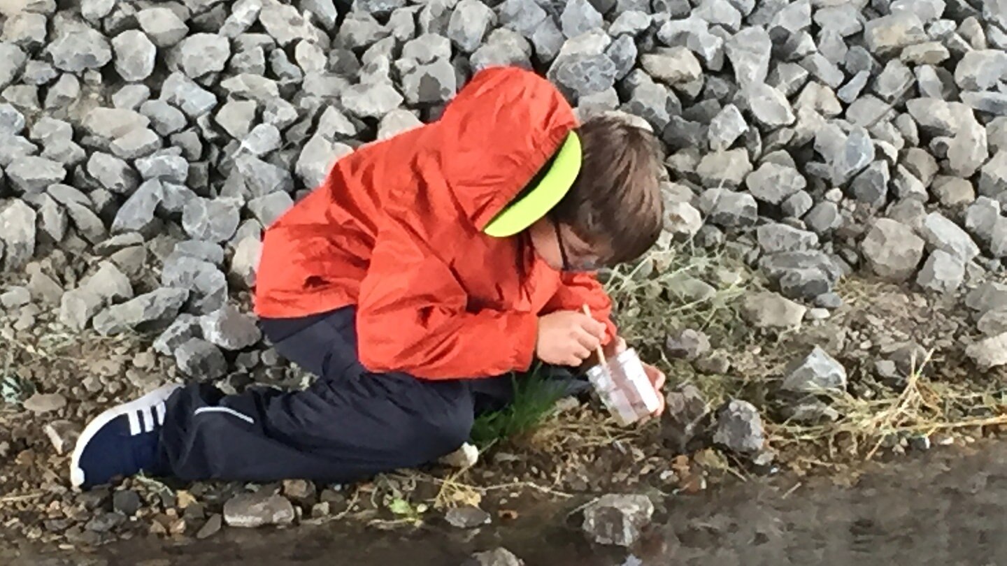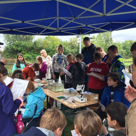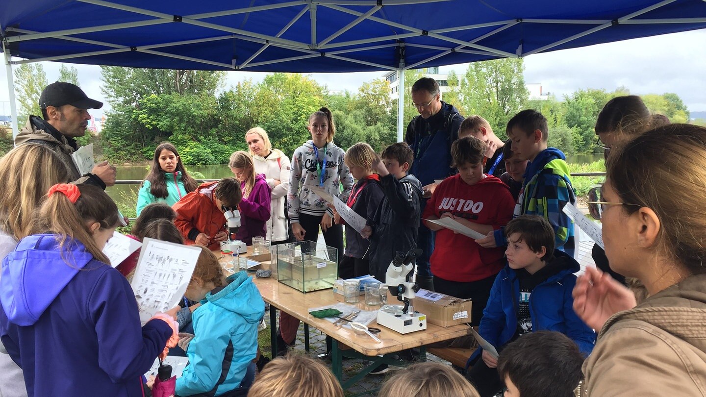 Anschließend ging es mit Gummistiefeln an das Flussufer und ins Wasser: An einer ruhigen und sicheren Stelle nahmen wir Schneckenegel, Krebstiere und Napfschnecken unter die Lupe. Mit Reagenzgläsern, einem Tapeziertisch, Bestimmungskärtchen und Mikroskop konnten wir zum Schluss die Wasserqualität bestimmen: Die Köcherfliegenlarve gab uns dazu den entscheidenden Hinweis: Das Wasser war „gut“.