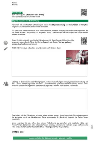 | Vertiefung 40‘ | Stigmatisierung und Vorurteile bei psychischen Erkrankungen | Partner- oder Kleingruppenarbeit | Arbeitsblatt 3, Internetzugang, Filme „Gezeichnete Seelen“ |