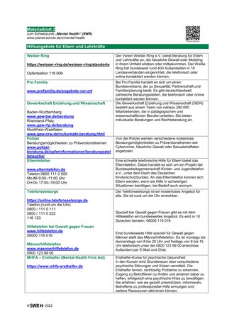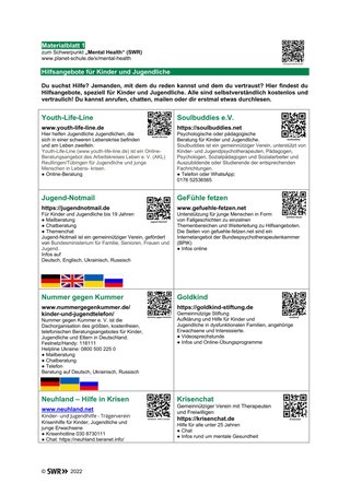 Materialblatt 1 enthält eine Liste mit Adressen und Ansprechpartner:innen. Diese sollte möglichst um regionale Anlaufstellen (Psychologische Beratungsstellen, Kinder- und Jugendpsychiatrien, usw.) ergänzt werden.