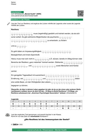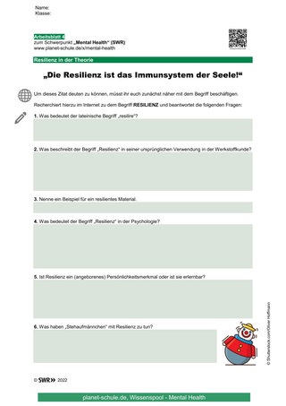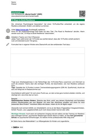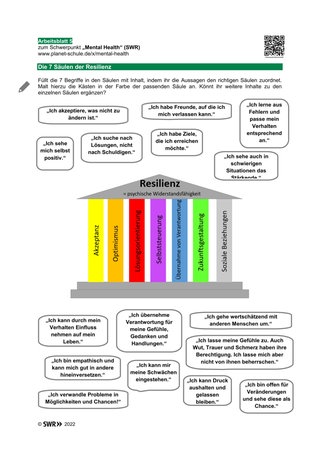 Die Arbeitsblätter 4 bis 7 widmen sich dem Thema Resilienz in Theorie und Praxis. In Partner- und Einzelarbeitsphasen eignen sich die Schüler:innen sukzessive Wissen zum Begriff, den 7 Säulen sowie 10 Wegen, Resilienz aufzubauen, an. Für die Bearbeitung von Arbeitsblatt 7 sind Englischkenntnisse vorausgesetzt.